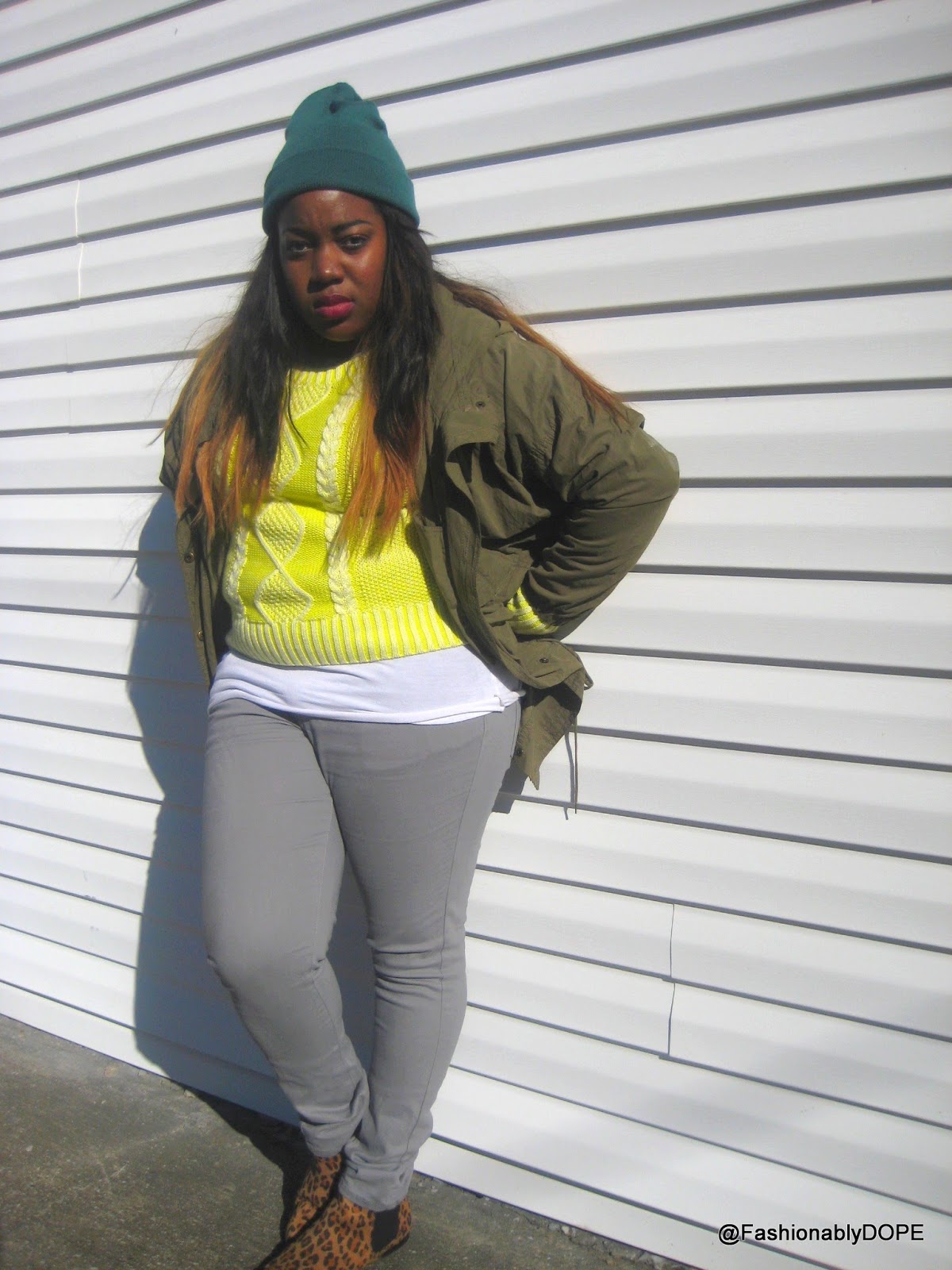 Olive Green parka - American eagle | Neon Sweater - Target |Grey Jeans - F21