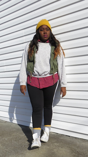 Red Plaid Shirt - Thrifted | Grey Sweatshirt -Thrifted | Army Green Vest - American Eagle