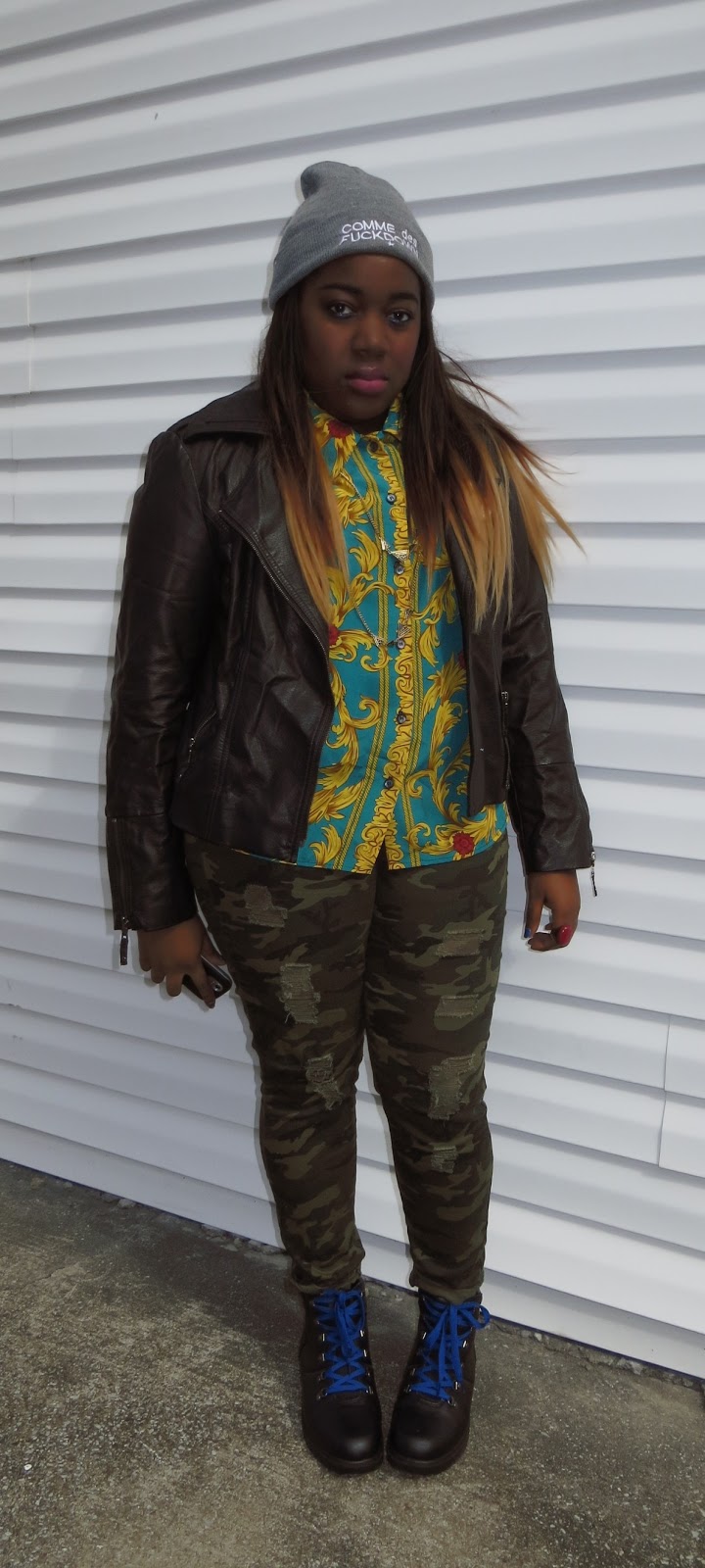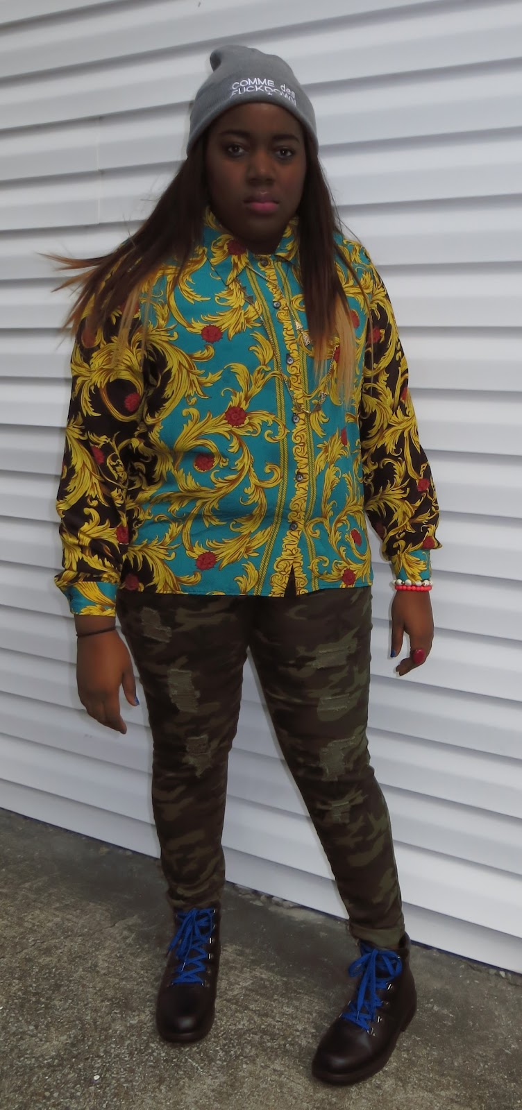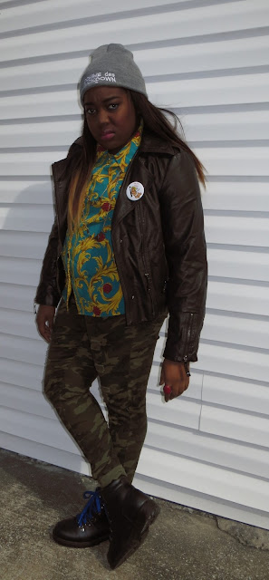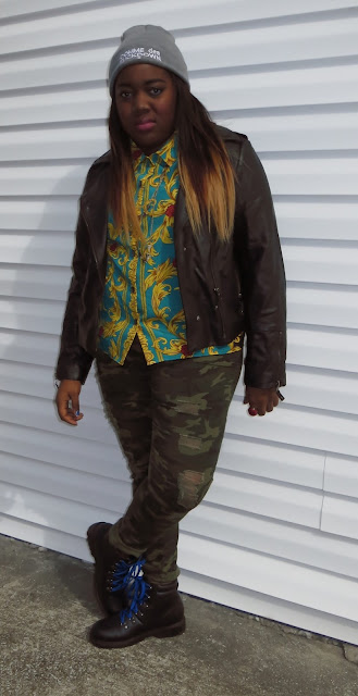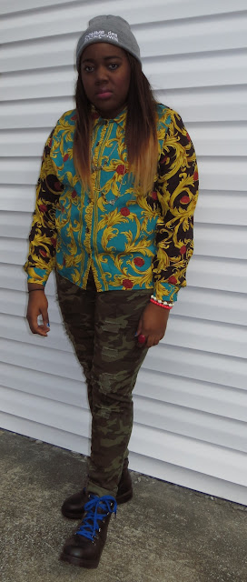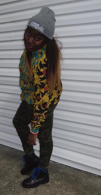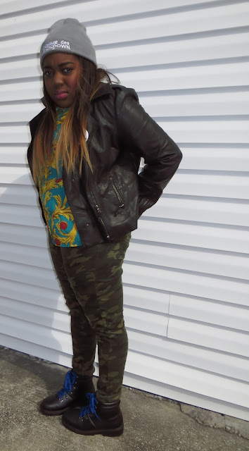 I woke up this morning with no earthly idea what to put on, the weather today was blah so I was sure that my outfit was gonna be blah too. I stumbled across this shirt in my closet and decided to take a chance and clash some prints today. I am absolutely in love with how this outfit turned out. I am all for mix and matching prints especially loud ones. I love how the camo pants take a backseat in this look and become almost a neutral. This shirt is just so amazing. I love the mixture of the gold, black and turquoise together with the spashes of this cranberry color. I feel so 90's Vogue in this shirt, it screams Versace with its baroque print, gold details throughout and the pop of color. This outfit is definitely a head-turner, although I'm sure most people are wondering if I got dressed in the dark. These boots were only $8, what a steal! The contrasting blue laces just make the simple boot look a tad bit more interesting. I swear I won't know what to do when it's too warm to wear beanies, I seriously wear this beanie like its going out of style. Also I'm extremely pleased with my eye make-up today especially since I rarely do it.