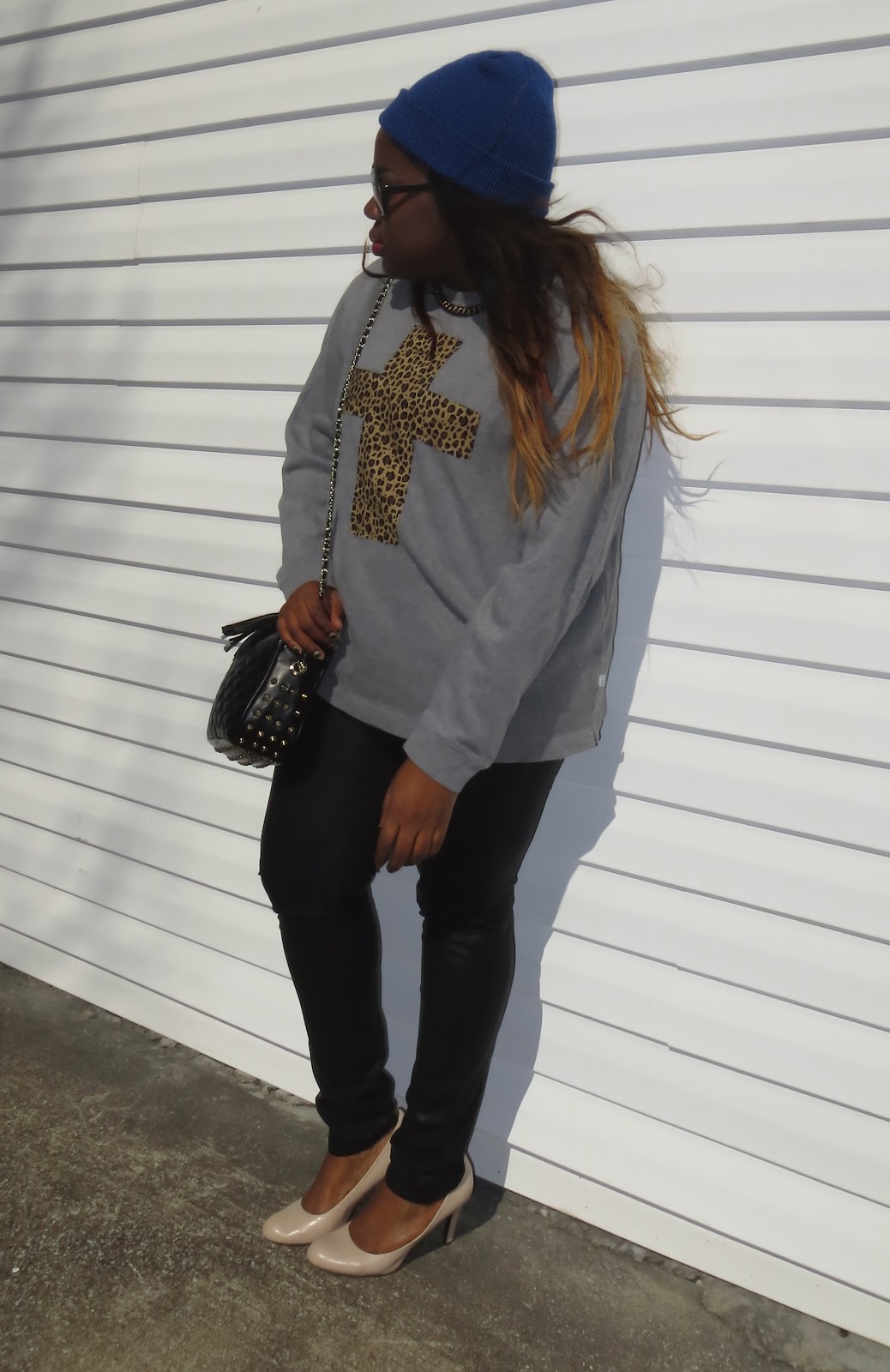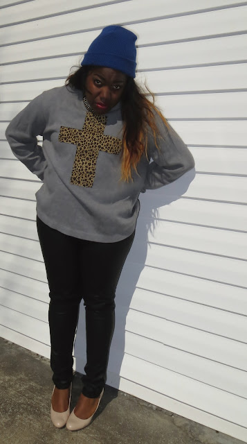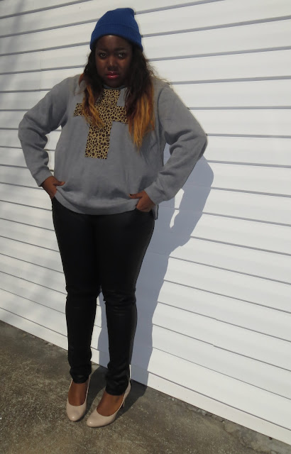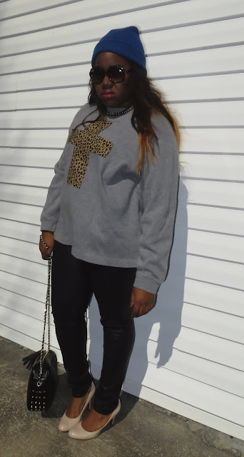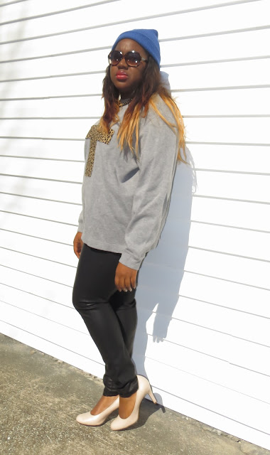 Today has been a beautiful day, the sun was shinning and everyone knows that always puts me in a crazy good mood. I have literally had this outfit in my mind for some months now. I can't even remember where I got it from now but it was probably tumblr-inspired. I woke up this morning and decided to make this sweatshirt. I've been putting it off long enough and since I had a few hours before class, I went at it. I have a current love affair with the color grey. Although black will always be my favorite color to put on, I have been gravitating towards grey items lately. If a shirt comes in black, grey and white, I'll choose grey hands down. It is slowly becoming my favorite neutral. I'm not done with this jumper yet but I seriously have no patience and wanted to wear it today. I see this being something I throw on a lot this spring, it's quite trendy so i can pair it with many outfits and it's warm for those windy spring days. I have always thought leather (or faux leather jeans) were so rock'n'roll and fit my persona but I knew I couldn't pull them off. I no longer am saying that. I am in love with these pants and I definitely loved dressing them up and making it more sophisticated. I honestly can't wait to throw these on with a band tee and some chucks soon though. I have a slight shoe obsession and have debated over getting a pair of cute classic nude pumps for the longest. I got these babies on sale and I love how they look dainty and chic. Which only fuels my dainty heel obsession. I blame Rihanna, I swear I do. All her heels lately have been so coy and lady like.