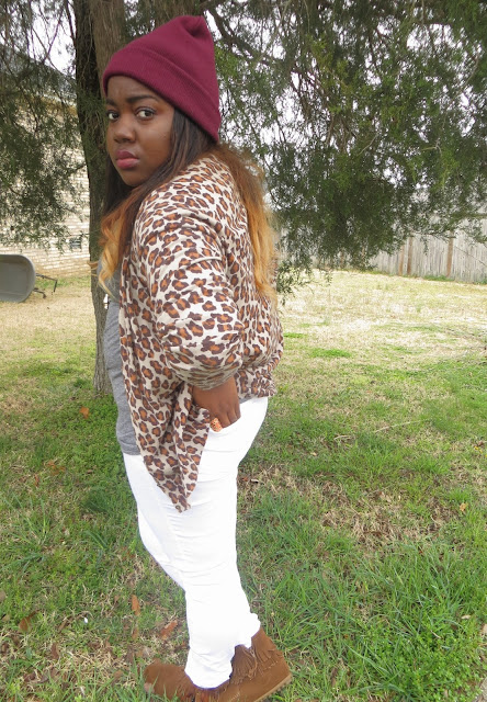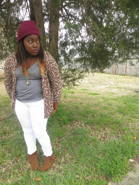 Cheetah cardigan - Thrift'd | White skinny jeans - Forever 21
