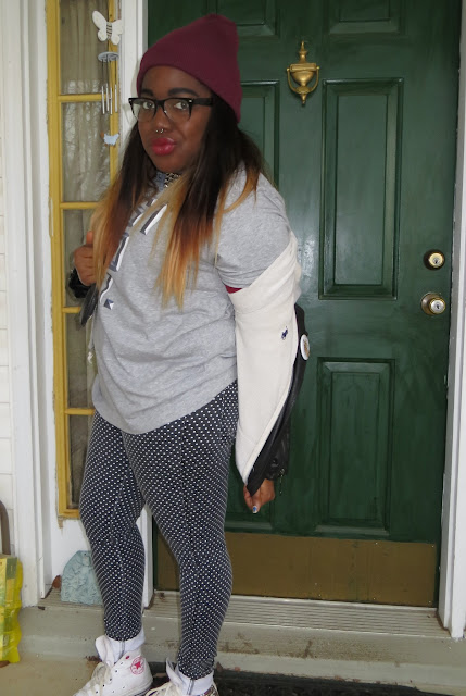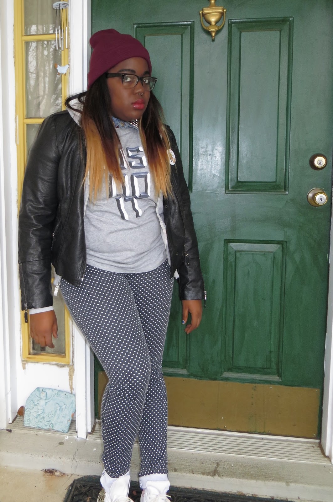 There is nothing I hate more than the rain, yeah I get its purpose and what not but seriously I cannot stand getting rained on; which is exactly what happened to me whilst taking pictures this morning. Luckily I took refuge on my front porch. Another thing that annoys me about rainy days is actually getting dressed for one, I would much rather nap all day long and watch movies. I love rediscovering things in my closet, like these polka dot pants. I love printed jeans, they make such a statement that you don't have to do much else. I decided to layer sporty basics on top like this Nike, i grabbed out of my brother's closet and this warm zip up hoodie. Lastly I topped it off with my faux leather jacket which has seriously become an everyday jacket for me. I have an obsession with chucks and I feel foolish wearing canvas shoes in the rain but these shoes completed the outfit for me so yeah!