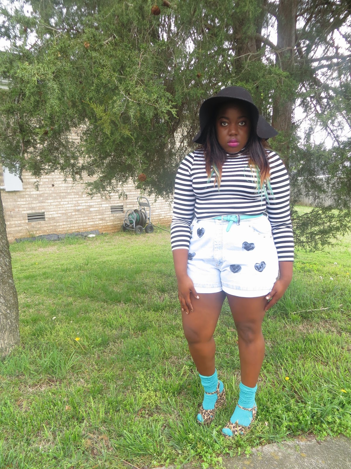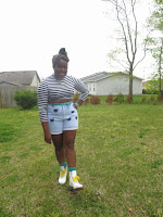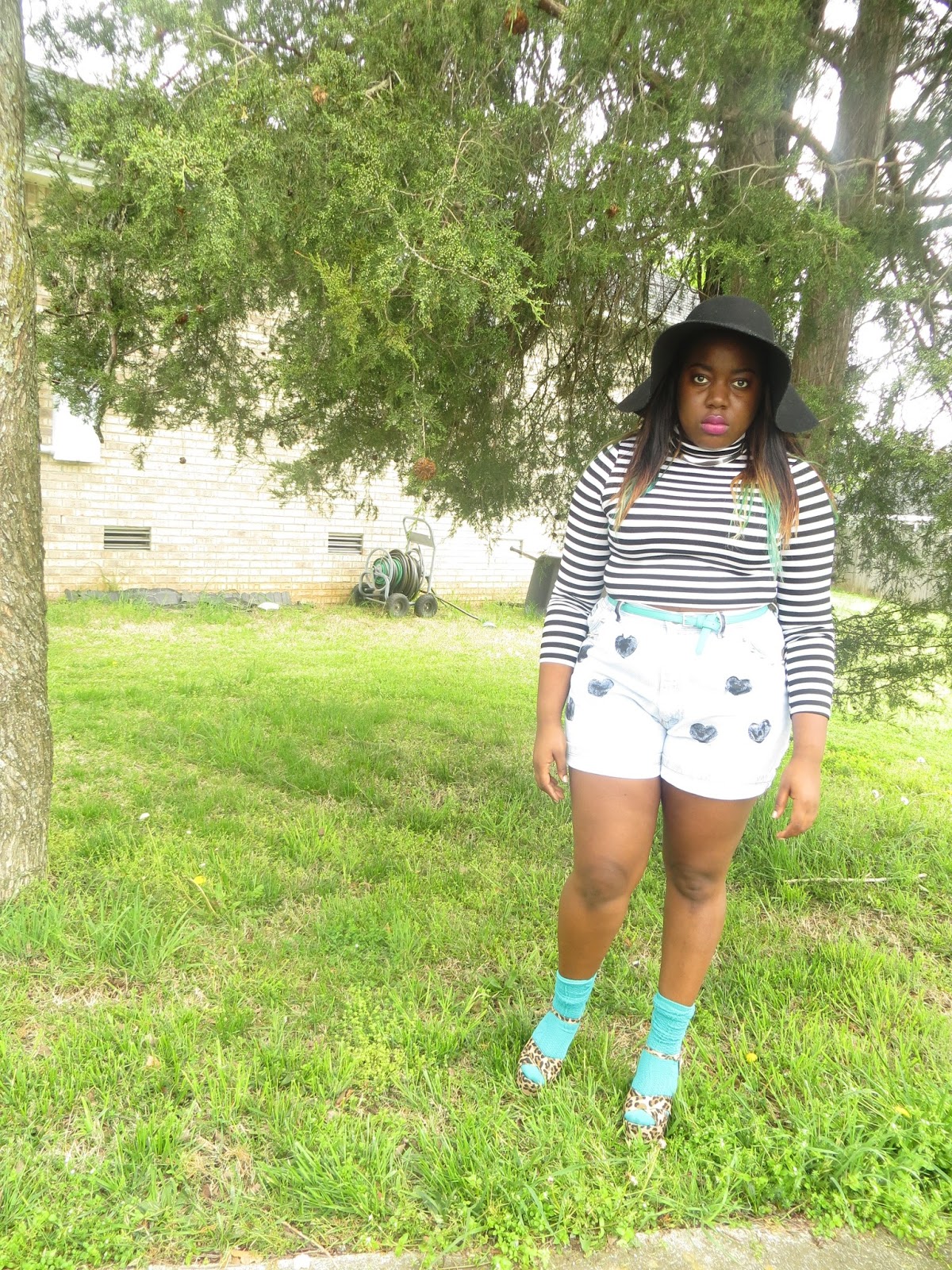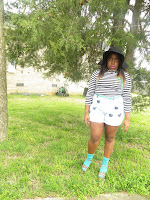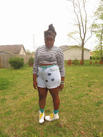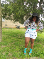 I always say that it's shoes and accessories that make an outfit so I decided to play with that idea today. I decided to style these new shorts I DIY'd last night in two different ways. I grabbed this simple stripped faux turtleneck crop top and got to work. The first styling of this outfit is above. I love wearing socks with sandals and as soon as spring hits, I go looking for new combos I can come up with. I figured since this outfit was pretty simple with the black and white I could throw on a bright teal sock with a loud print like cheetah to add a little oomph. This black floppy hat makes this outfit feminine for me. I see this outfit as a getting lunch with the girls on a Sunday afternoon.