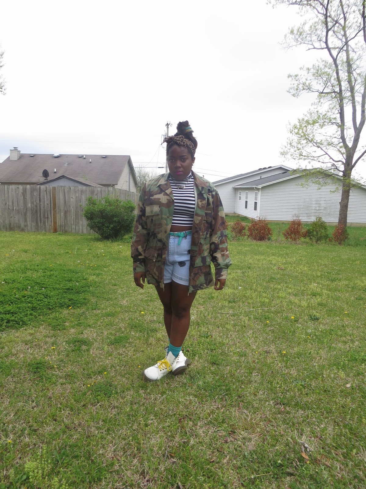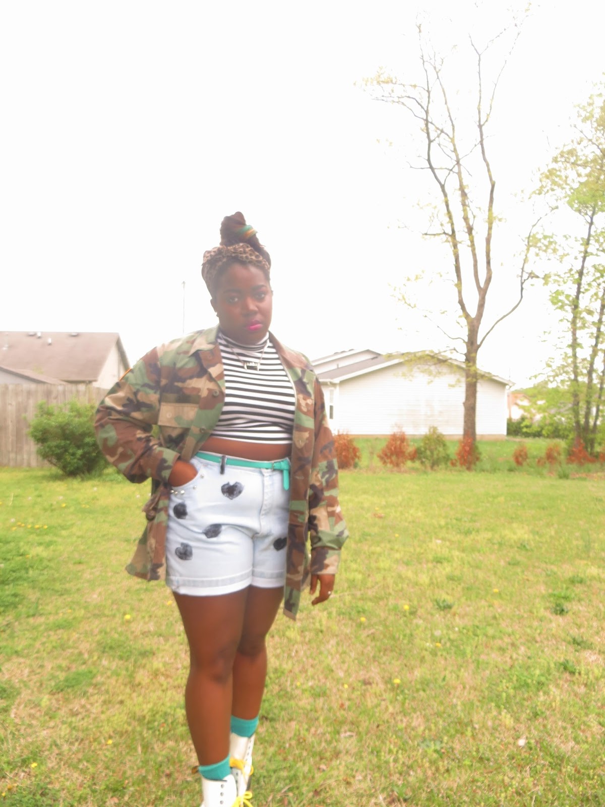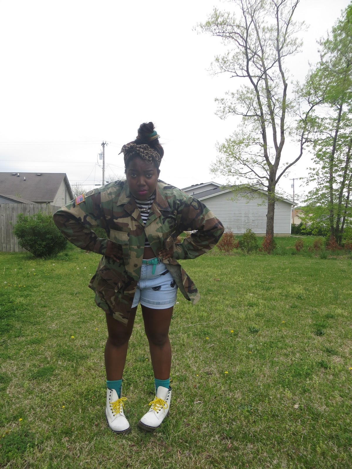 Next up is an outfit I'd wear to go shopping or in today's case to go to class. I decided to put my hair in a messy top knot with a cheetah headband for a little pattern clashing. I decided to put on my white docs which are seriously my favorite boots at the moment. I broke the strap on my bright neon satchel so I've decided to use it as a clutch. I heard it was supposed to rain today as well so i grabbed by army jacket just for a little bit of warmth if it does.
