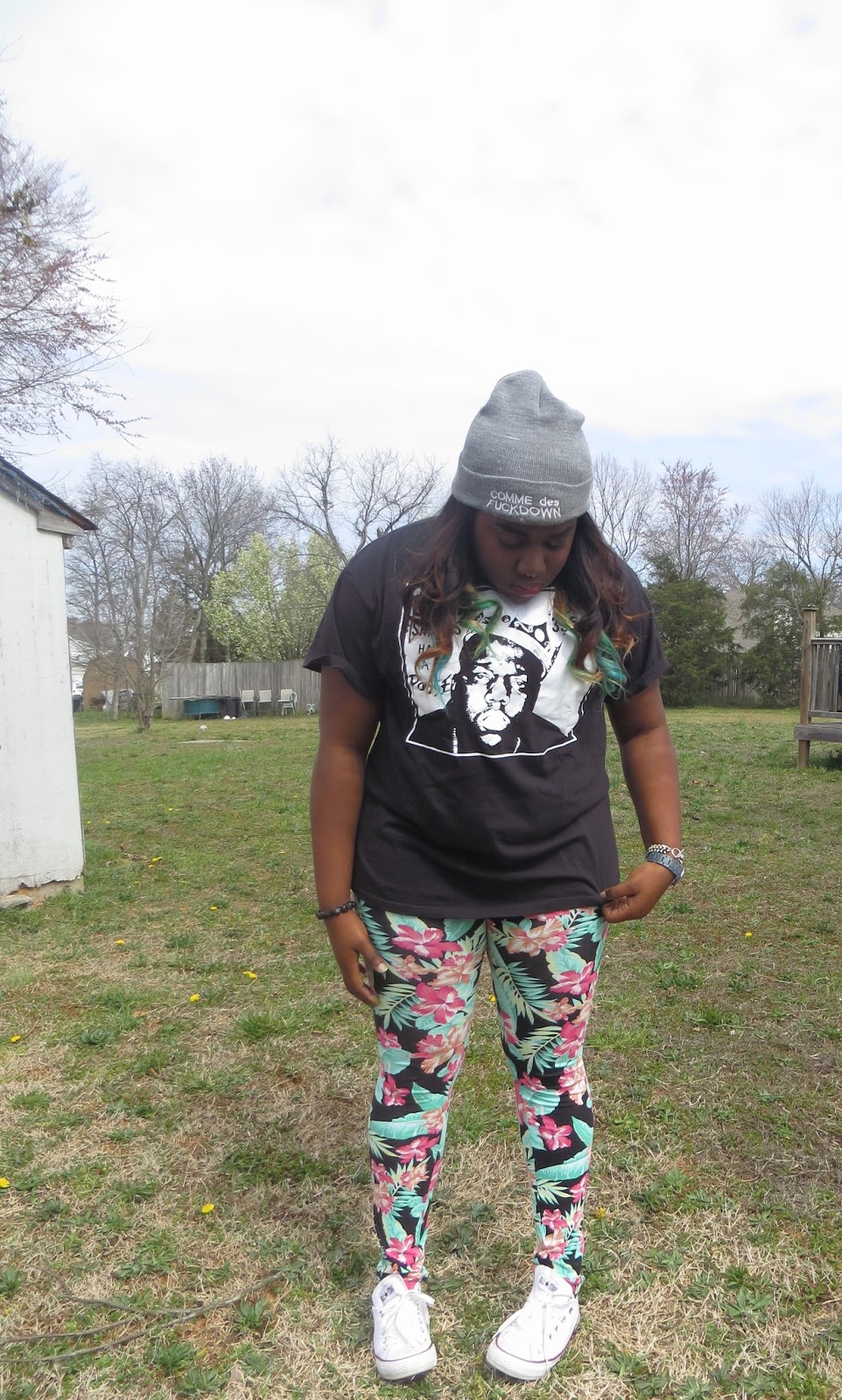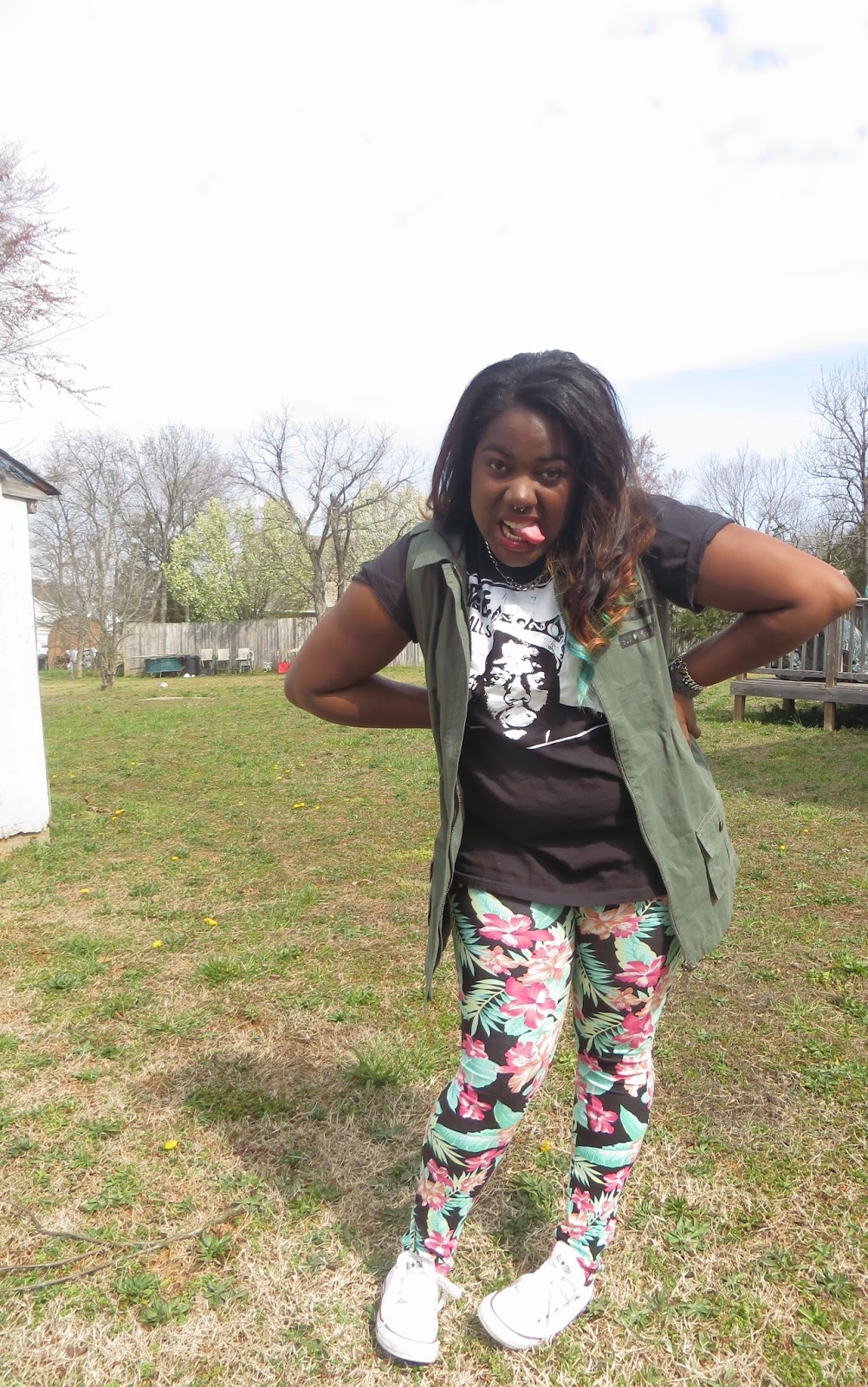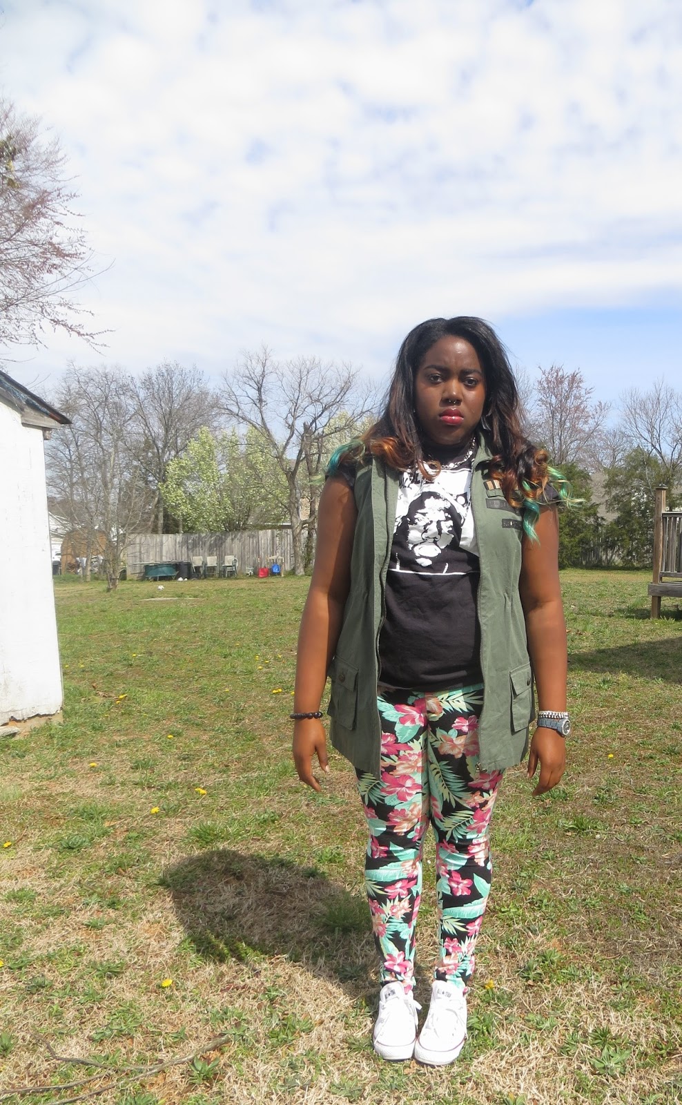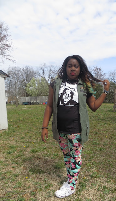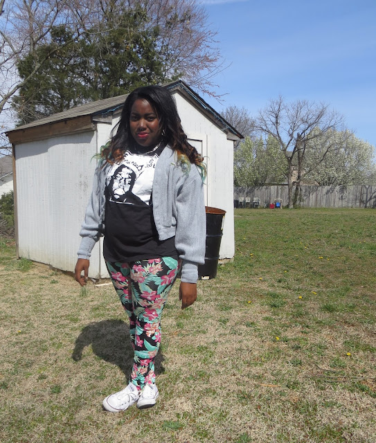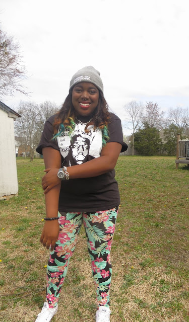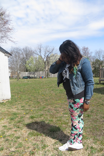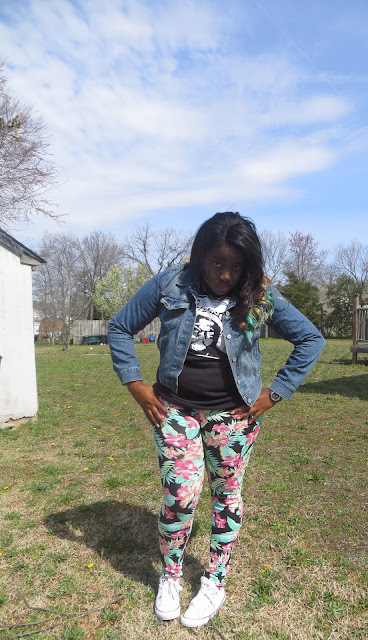 It's starting to feel like spring which makes me extremely happy. This morning I rolled out of bed and rolled into this outfit. I've been feeling quite lazy when it comes to putting outfits together as of late. I love it when I can piece together loud statement pieces because it makes the outfit effortless on my part. I love to let my clothes do the talking. I have been looking for a pair of leggings like these for ages, it's tropical and girly but the black background makes it a little more edgy. I am such a sucker for "band tees" as i classify them. Any shirt that has a lyric or picture of one of my favorite musical artists becomes a must have in my eyes. These white chucks are definitely becoming a spring/summer staple in my eyes. They just seem to match almost every outfit I come up with in my head. I wasn't sure what jacket to pair with my outfit today so I tried a few on while taking pictures. This outfit screams Spring to me without being too pastel, floral or girly, so it's a win in my book.