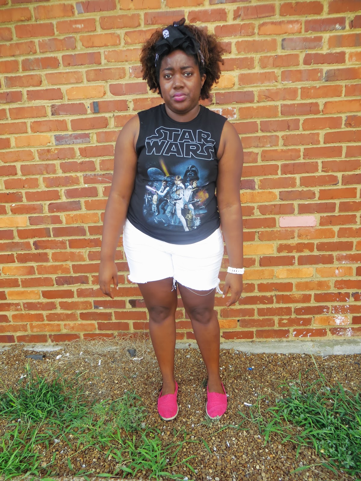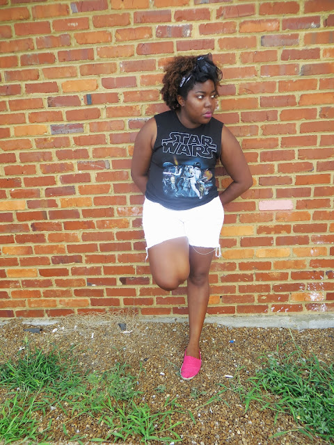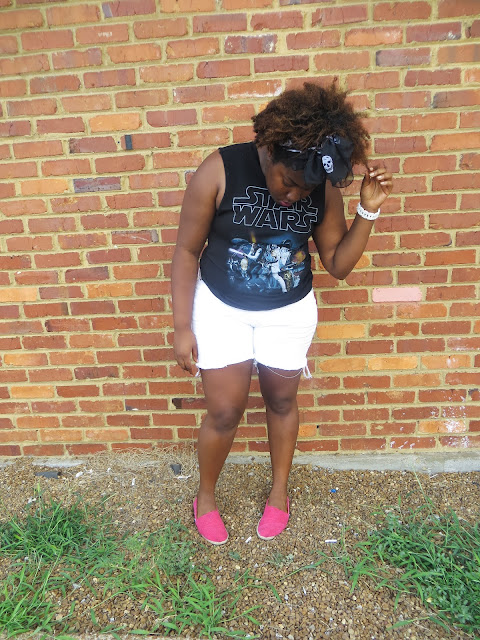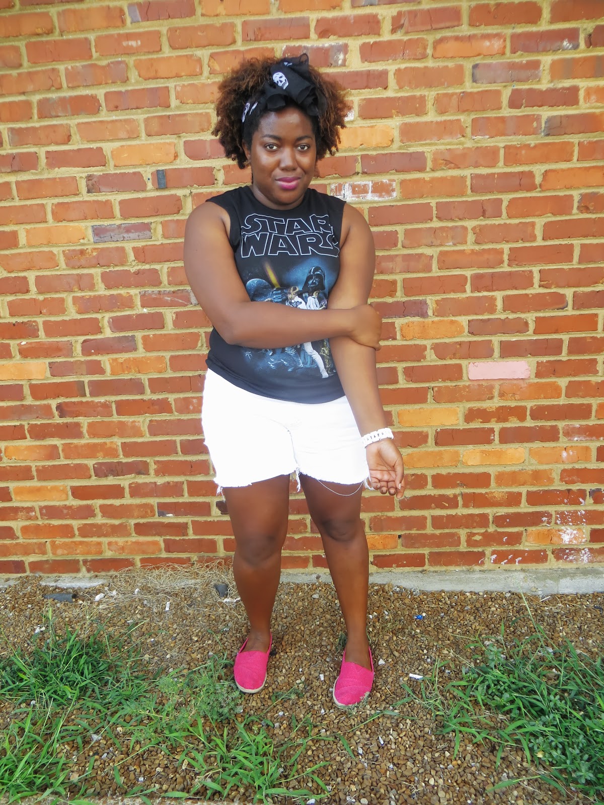 I had planned on staying in the house and vegging out all day but my Mommy asked me to run a few errands for her. This is the outcome of that phone call. I am a sucker for Pop Culture graphic tees. Star Wars was one of those movies that everyone just has to see. I still say Harry Potter is the greatest Sci-Fi movie franchise of all time but Star Wars definitely paved the way. I just wanted to be comfy today hence the toms and tank. I honestly believe I would wear white shorts every single day of summer if I had enough pair to do so. Then I would throw on a black shirt of some sorts. I consider this my summer uniform.