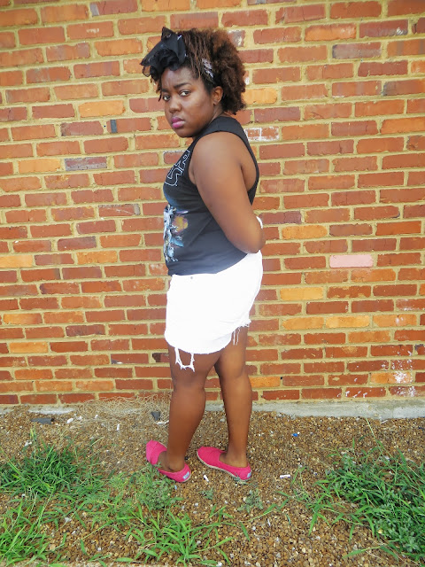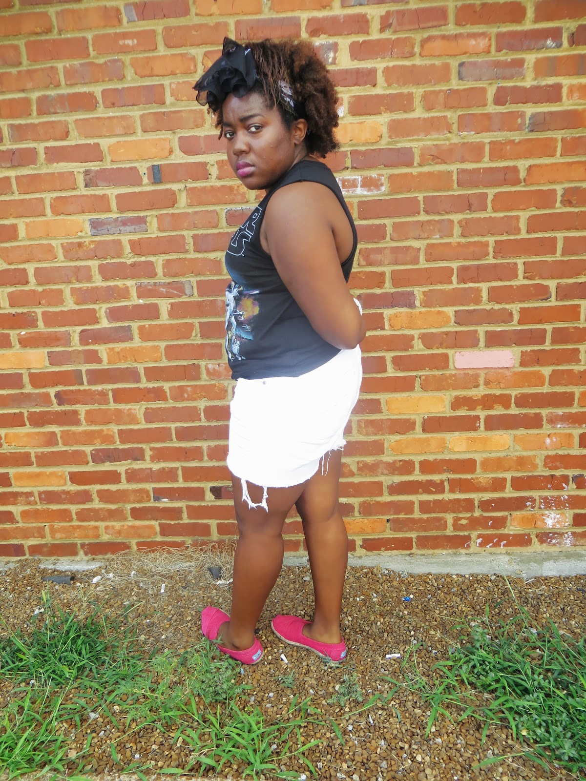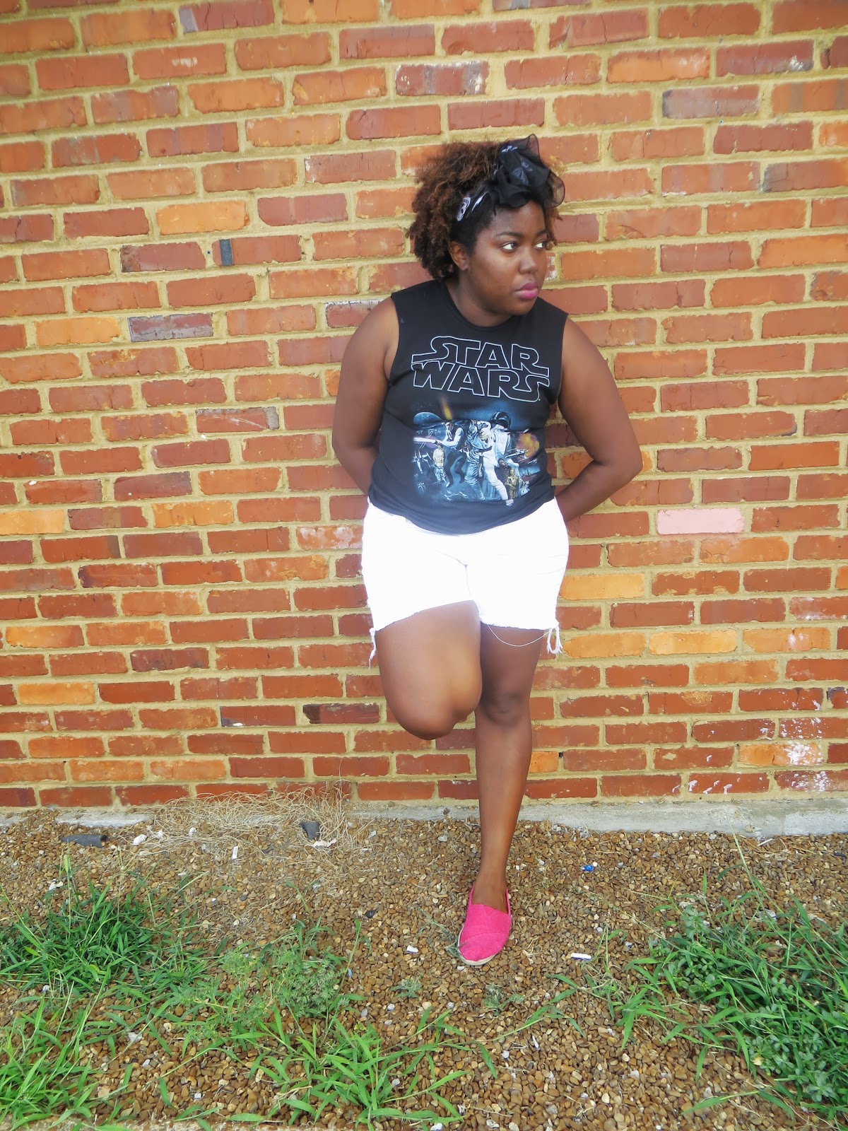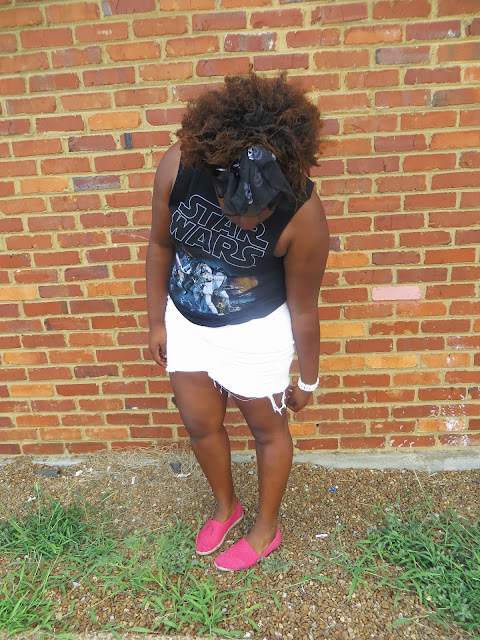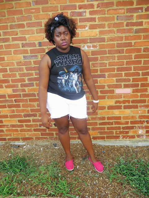 I had planned on staying in the house and vegging out all day but my Mommy asked me to run a few errands for her. This is the outcome of that phone call. I am a sucker for Pop Culture graphic tees. Star Wars was one of those movies that everyone just has to see. I still say Harry Potter is the greatest Sci-Fi movie franchise of all time but Star Wars definitely paved the way. I just wanted to be comfy today hence the toms and tank. I honestly believe I would wear white shorts every single day of summer if I had enough pair to do so. Then I would throw on a black shirt of some sorts. I consider this my summer uniform.