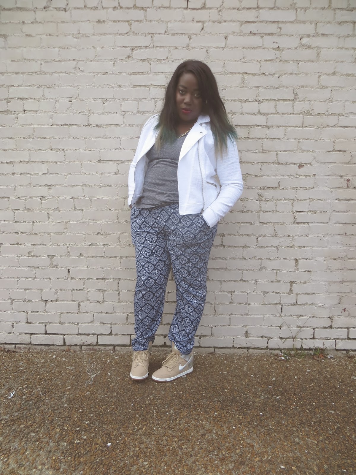 These joggers seemed "fancy" enough to me for a business dinner and also are super comfy that I could wear them all day to my classes. I paired them with my Tokyo Sky Hi Dunks and a plain grey tee. I knew it would get colder later on this evening so I grabbed this chic white moto-esque jacket.