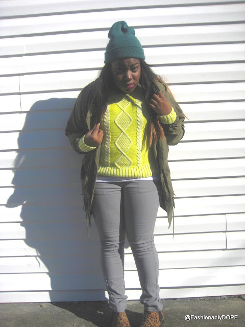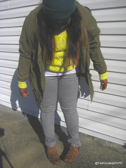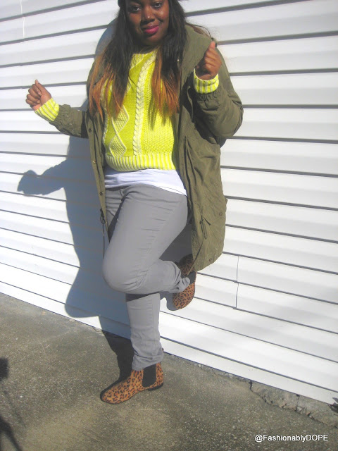 It has been crazy cold in Tennessee these past couple days and I am dreaming of the sun shinning down on me, a cool breeze, my toes in the sand and a drink in my hand. I have a small obsession with anything neon at the moment and this sweater is an indicator of that. I didn't actually realize that I was wearing this many shades of green but I love how they compliment each other. These grey jeans are a favorite of mine and were bought when grey was my obsession (definitely during the whole Fifty Shades of Grey hype era). I seriously think cheetah shoes are my weakness; plus they're the only logical way I can sneak animal print into my wardrobe. That being said these boots are super comfy and add the right amount of sass to this outfit.