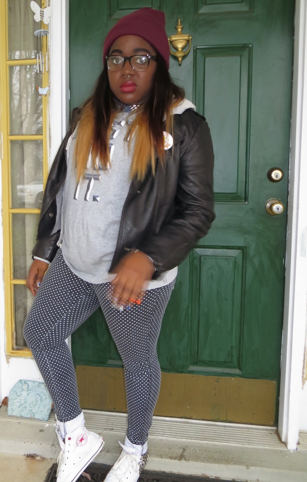 There is nothing I hate more than the rain, yeah I get its purpose and what not but seriously I cannot stand getting rained on; which is exactly what happened to me whilst taking pictures this morning. Luckily I took refuge on my front porch. Another thing that annoys me about rainy days is actually getting dressed for one, I would much rather nap all day long and watch movies. I love rediscovering things in my closet, like these polka dot pants. I love printed jeans, they make such a statement that you don't have to do much else. I decided to layer sporty basics on top like this Nike, i grabbed out of my brother's closet and this warm zip up hoodie. Lastly I topped it off with my faux leather jacket which has seriously become an everyday jacket for me. I have an obsession with chucks and I feel foolish wearing canvas shoes in the rain but these shoes completed the outfit for me so yeah!