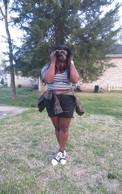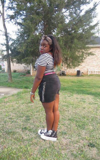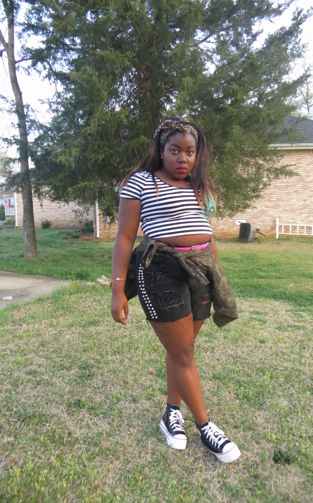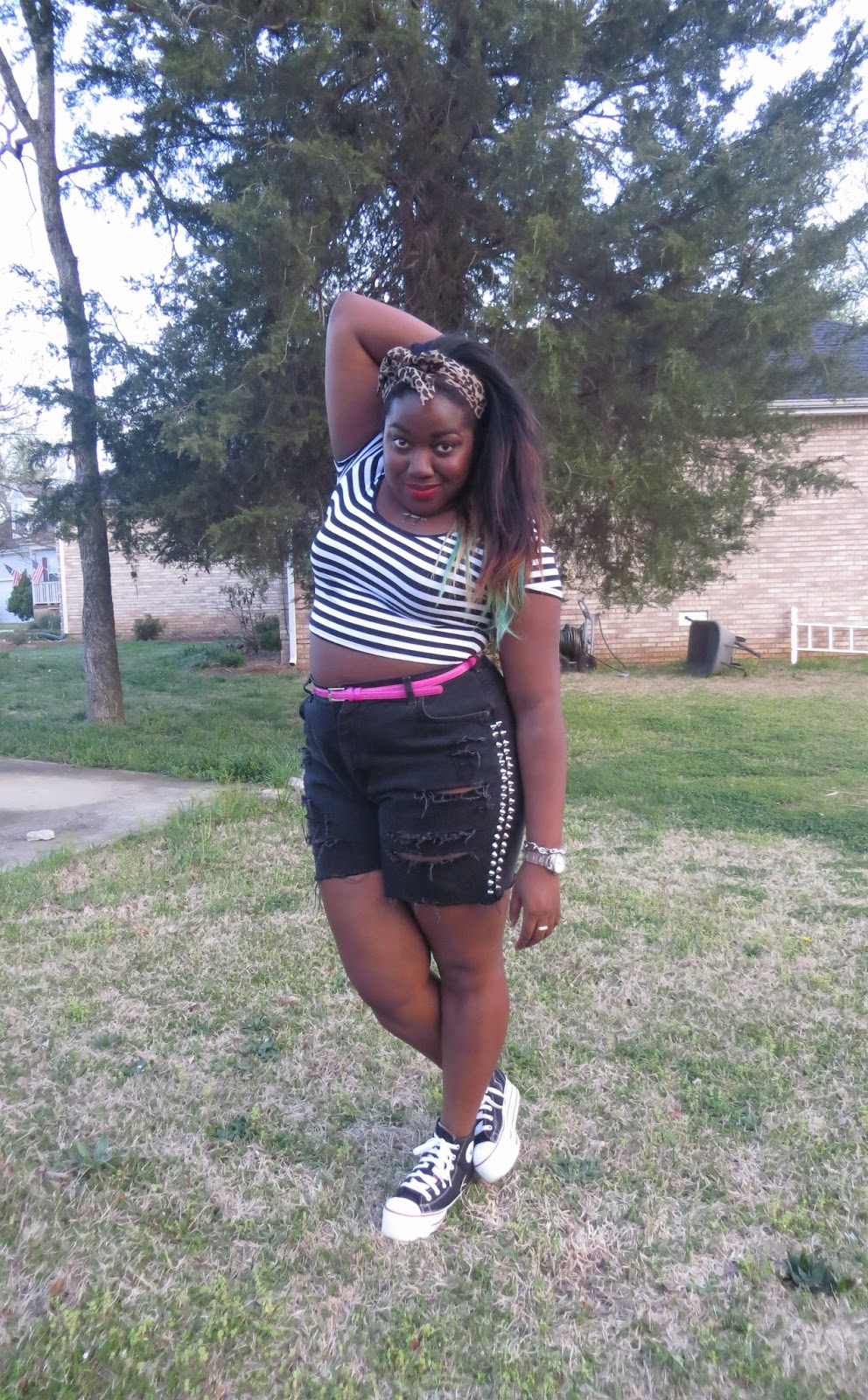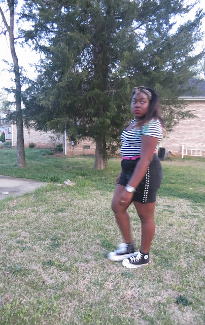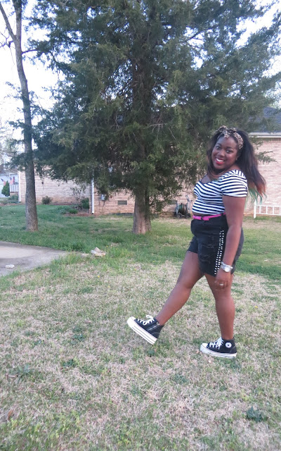 Today was a scorcher, okay well maybe not but it definitely felt more like summer than spring. I enjoyed every minute of it. It's fashion week at my school, and I decided to invite one of my adopted little sisters to attend an event with me. Tonight was the trunk show. She really enjoyed herself and is excited about being in the Fashion Merchandising program here. I love being able to talk to people who are just dipping their toe in the the ocean of fashion. Corny metaphor, huh?! Anywho I have been dying to wear these shorts for awhile now and I was just waiting for the warm weather to show up. Today these just felt right. I have been on the fence about crop tops for months now since I don't have washboard abs but I decided that I love them regardless. I have been falling in love with all the black and white outfits I've been noticing in the fashion world so I thought I'd do my variation. Honestly, If I'd wear these platform chucks every single day If I could. They are  so comfortable and such a show stopper. I plan on buying a pair of double platforms in the near future.
