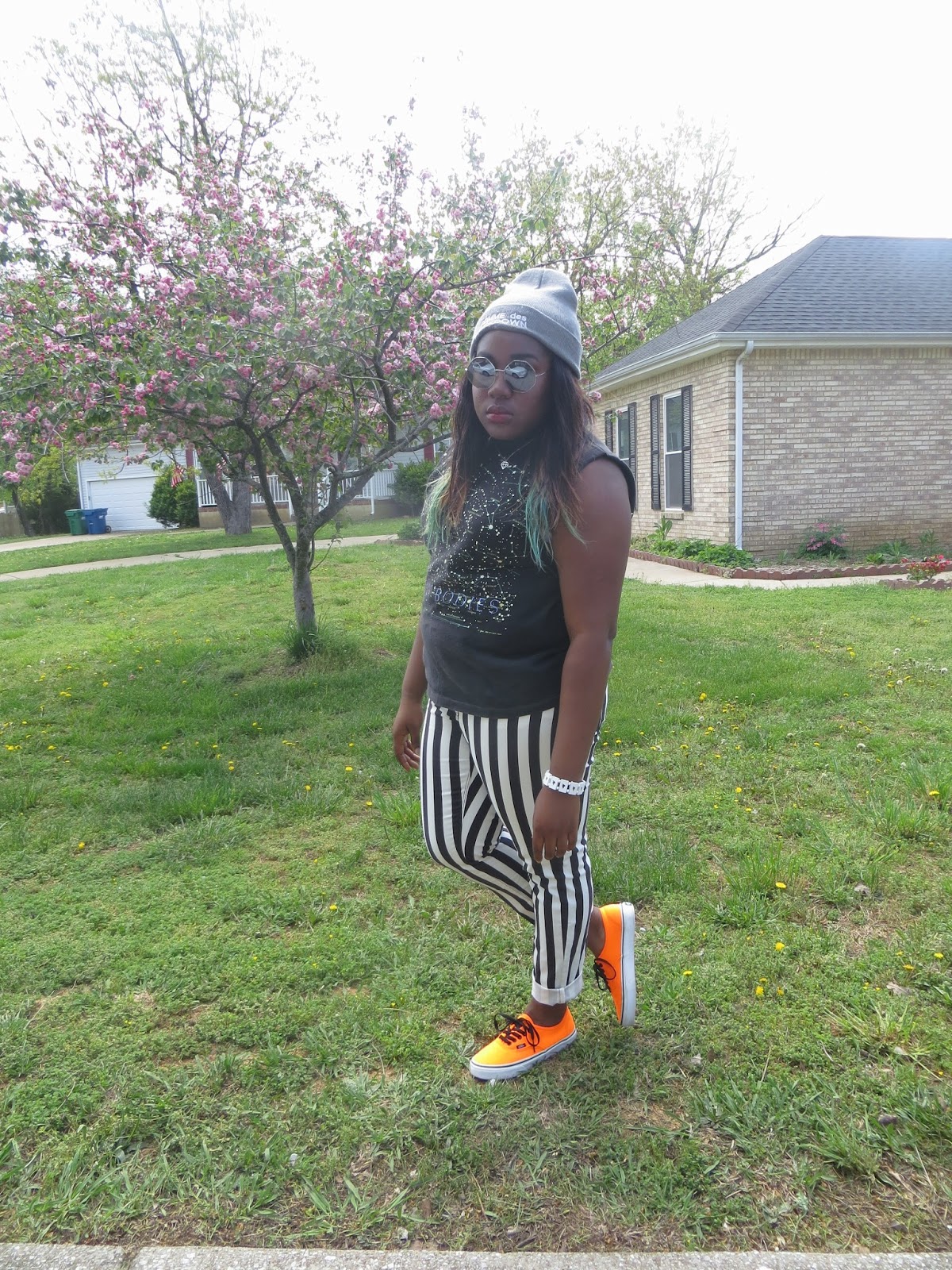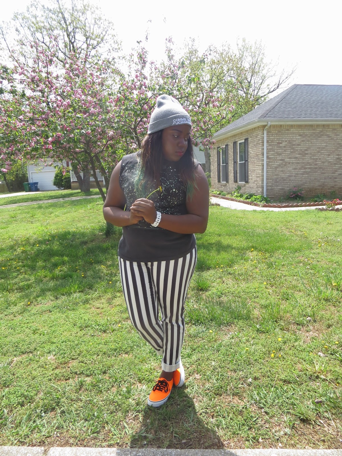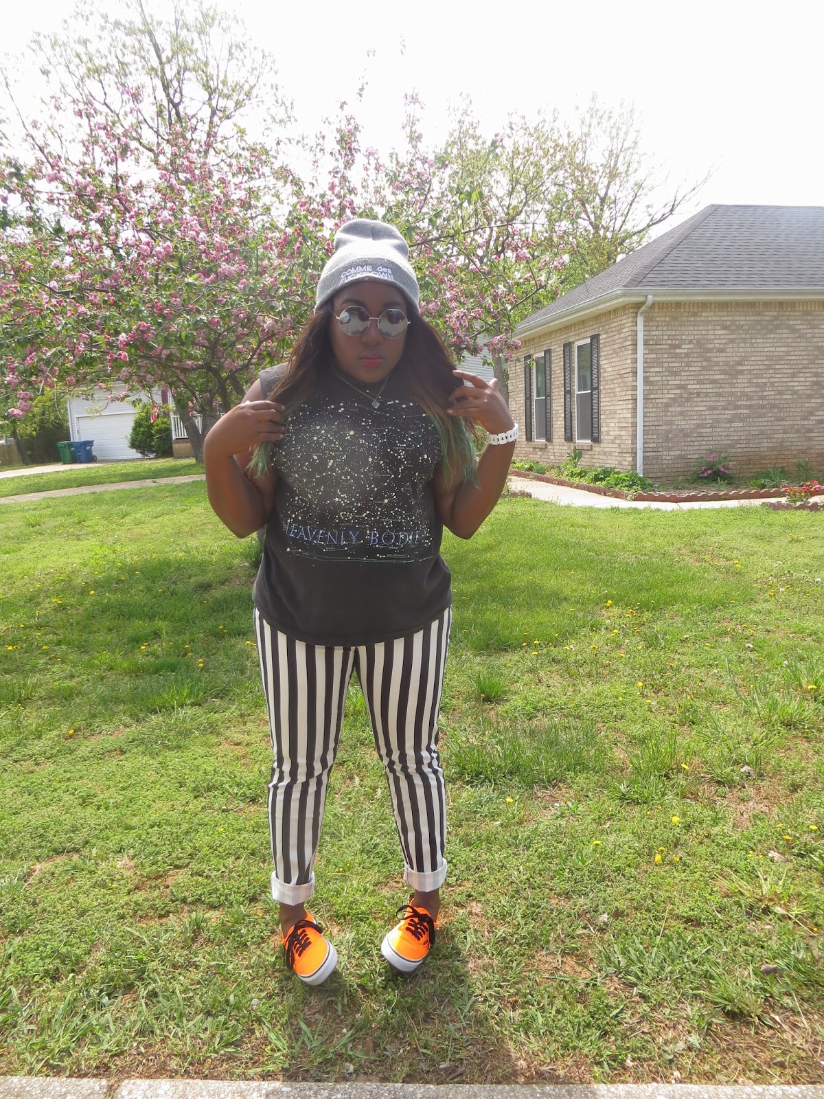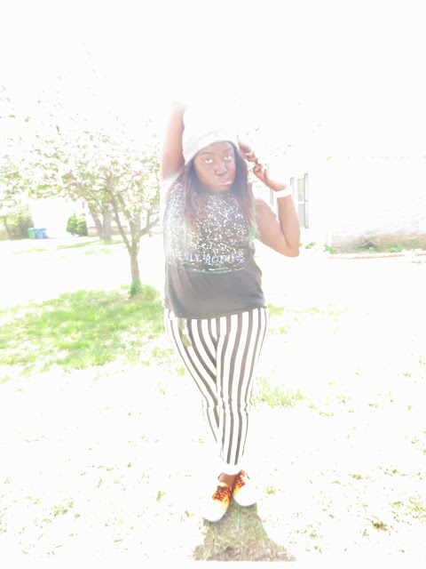 Today should be named the return of the smudge. Luckily the smudge hit my shirt in almost every picture so it just makes this awesome tank look out of this world. Seriously though how epic is this shirt. I am such of a fan of this galaxy trend we've been seeing as of late. When I saw this tank, it was mine no ifs, ands, or buts, about it. I cannot even tell you how long I've wanted a pair of vertically stripped jeans but I was never willing to pay to get them. When these popped up on Forever 21's website a few weeks ago and for only $20, it seemed like destiny. I absolutely adore them, they are my favorite pair of printed jeans. I decided to bring out my baby loves, or should i say these neon vans out again. I thought with all the black and white that this outfit needed a pop of color. Can I tell you that I am so sad that it's getting hot and my beanies will have to sit around waiting for fall to come back. This beanie has literally been attached to my head since I got it back in February. I am excited for summer head-wear though and am currently searching for the perfect snap-backs to complete this summer's looks. Wish me luck!