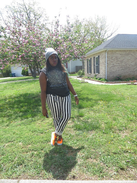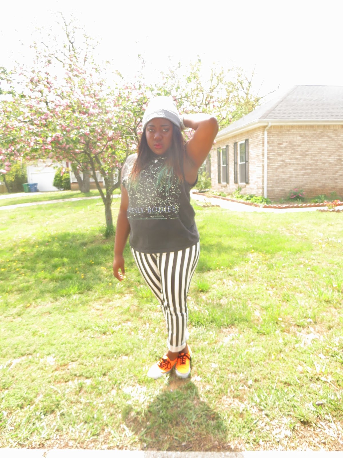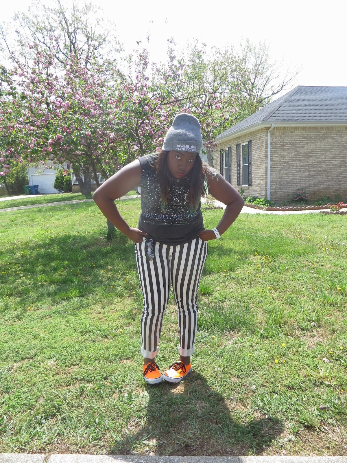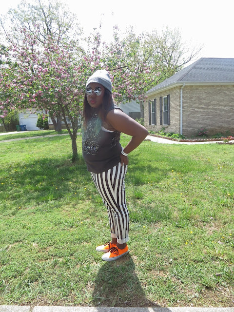 Today should be named the return of the smudge. Luckily the smudge hit my shirt in almost every picture so it just makes this awesome tank look out of this world. Seriously though how epic is this shirt. I am such of a fan of this galaxy trend we've been seeing as of late. When I saw this tank, it was mine no ifs, ands, or buts, about it. I cannot even tell you how long I've wanted a pair of vertically stripped jeans but I was never willing to pay to get them. When these popped up on Forever 21's website a few weeks ago and for only $20, it seemed like destiny. I absolutely adore them, they are my favorite pair of printed jeans. I decided to bring out my baby loves, or should i say these neon vans out again. I thought with all the black and white that this outfit needed a pop of color. Can I tell you that I am so sad that it's getting hot and my beanies will have to sit around waiting for fall to come back. This beanie has literally been attached to my head since I got it back in February. I am excited for summer head-wear though and am currently searching for the perfect snap-backs to complete this summer's looks. Wish me luck!