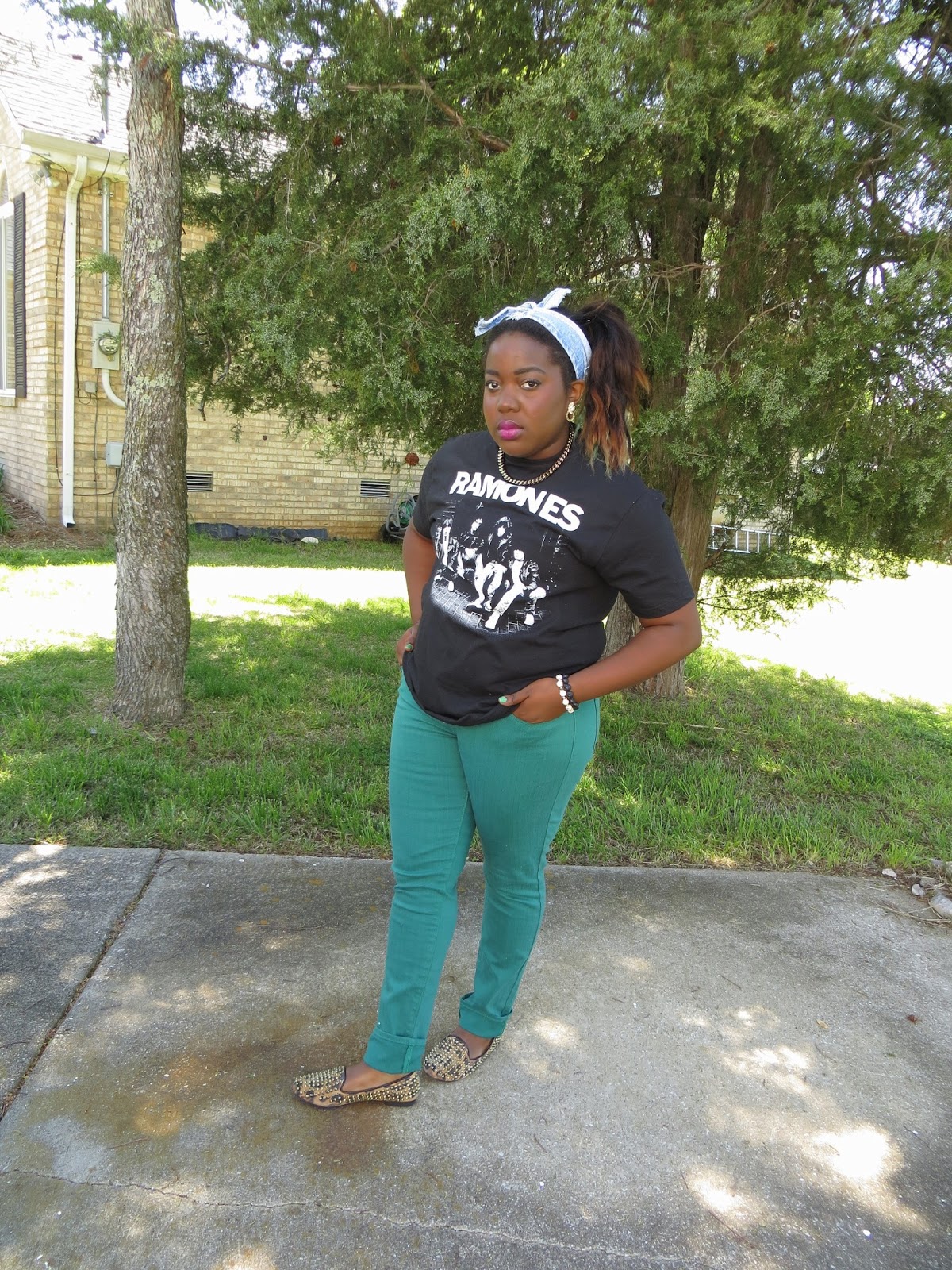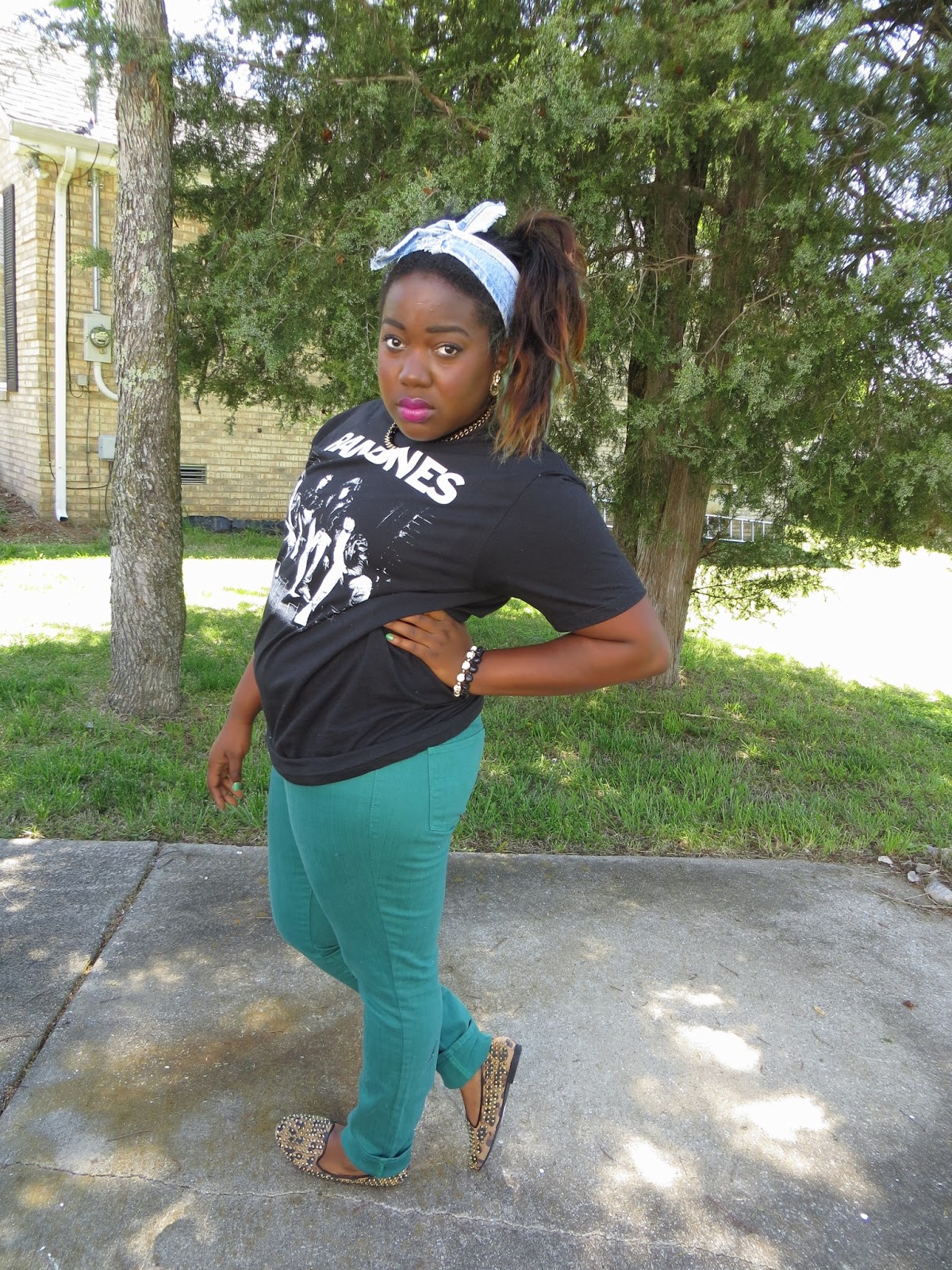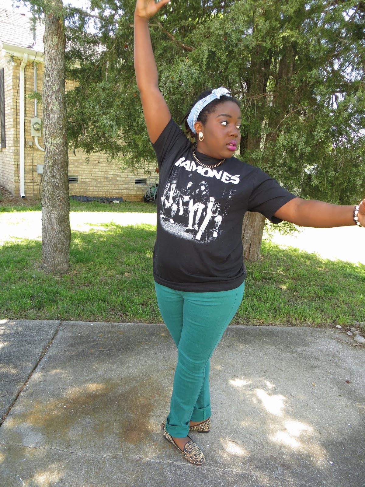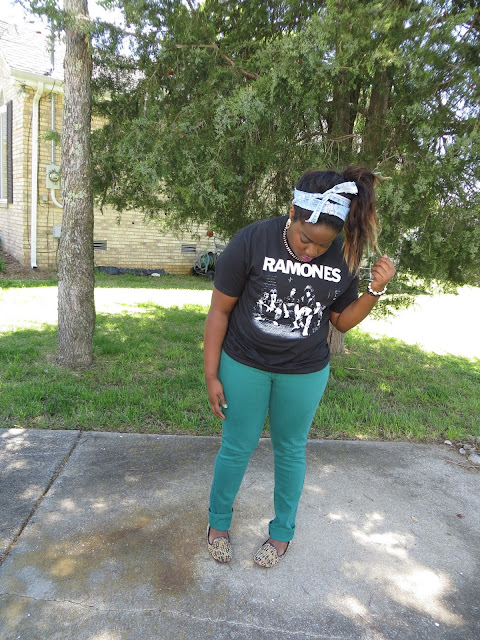 I love the options warm weather gives me. I love the fact that i can get up throw on some jeans, shirt, loafers and keep it moving. Today I just didn't feel like being bothered with my appearance So i guess you can say I tried to blend in. The green Levi jeans are a new purchase and they were definitely worth it. I love this color. I started a love affair with denim ages ago and it's just recently that I've moved on to colored and printed denim. These jeans just scream Spring/Summer to me but I also see many ways they can be worn in the colder months too. I was looking around for a headband to wear but couldn't find one I liked so I decided to sew the bottoms of two shorts I had cut up to DIY together and viola... denim headband. I don't know when I feel in love with The Ramones, probably while watching one of those 90s inspired movies I love so much. I loved how unbusy their outfits were, fitted tanks, fitted jeans, and some sneakers. Sometimes simplicity says so much more than a busy outfit ever could.