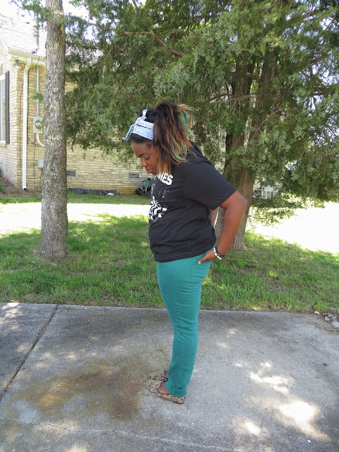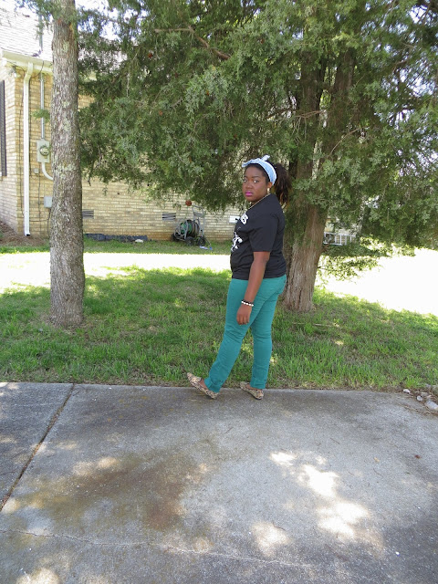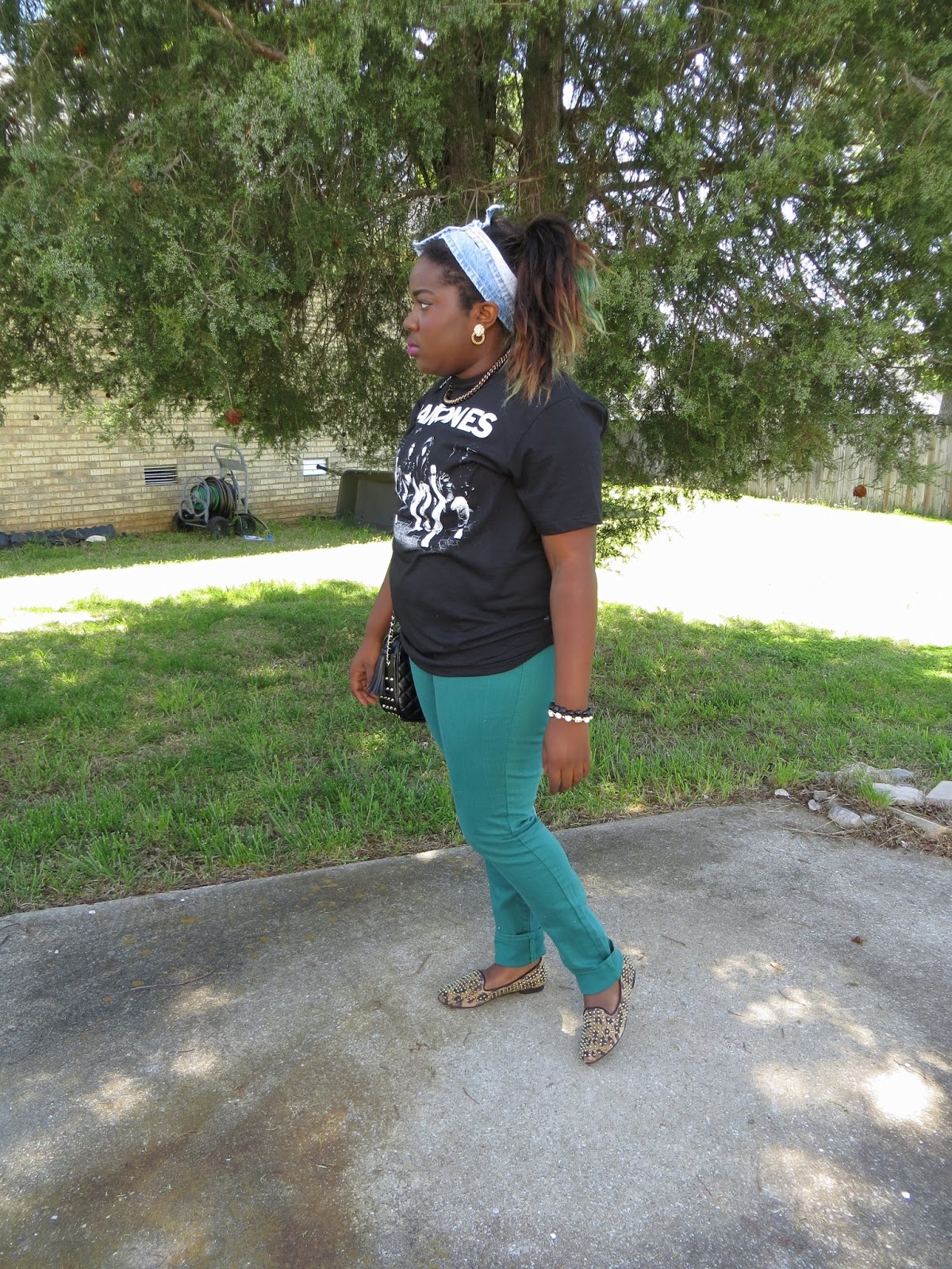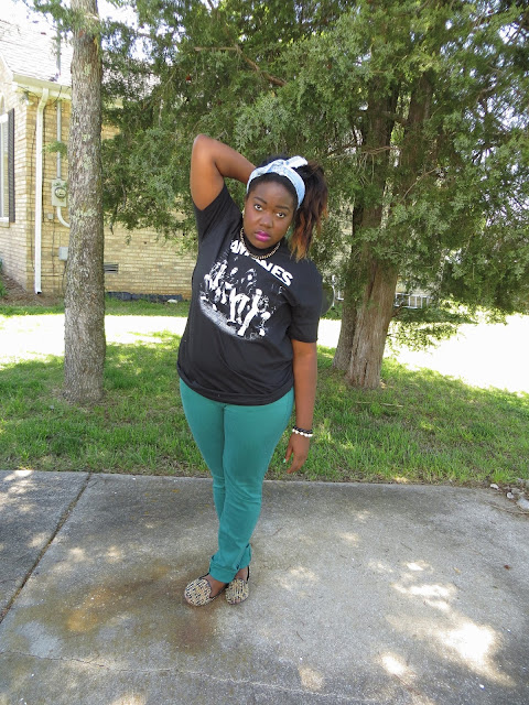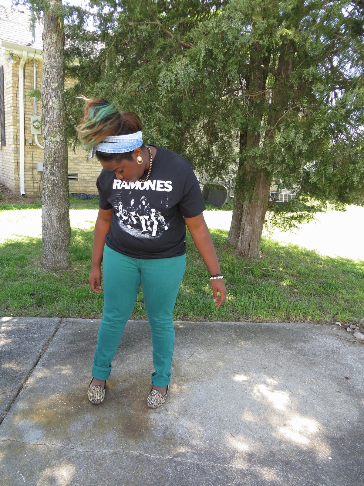 I love the options warm weather gives me. I love the fact that i can get up throw on some jeans, shirt, loafers and keep it moving. Today I just didn't feel like being bothered with my appearance So i guess you can say I tried to blend in. The green Levi jeans are a new purchase and they were definitely worth it. I love this color. I started a love affair with denim ages ago and it's just recently that I've moved on to colored and printed denim. These jeans just scream Spring/Summer to me but I also see many ways they can be worn in the colder months too. I was looking around for a headband to wear but couldn't find one I liked so I decided to sew the bottoms of two shorts I had cut up to DIY together and viola... denim headband. I don't know when I feel in love with The Ramones, probably while watching one of those 90s inspired movies I love so much. I loved how unbusy their outfits were, fitted tanks, fitted jeans, and some sneakers. Sometimes simplicity says so much more than a busy outfit ever could.