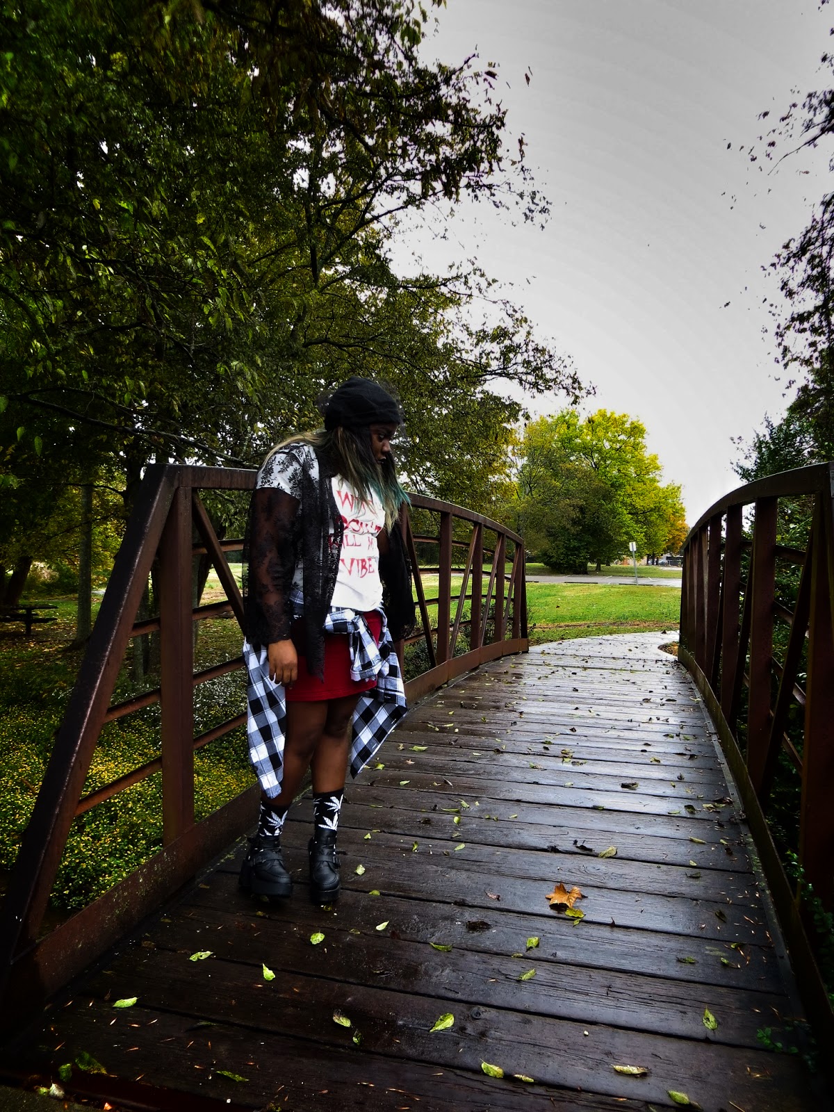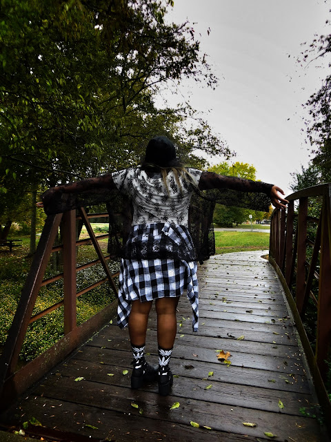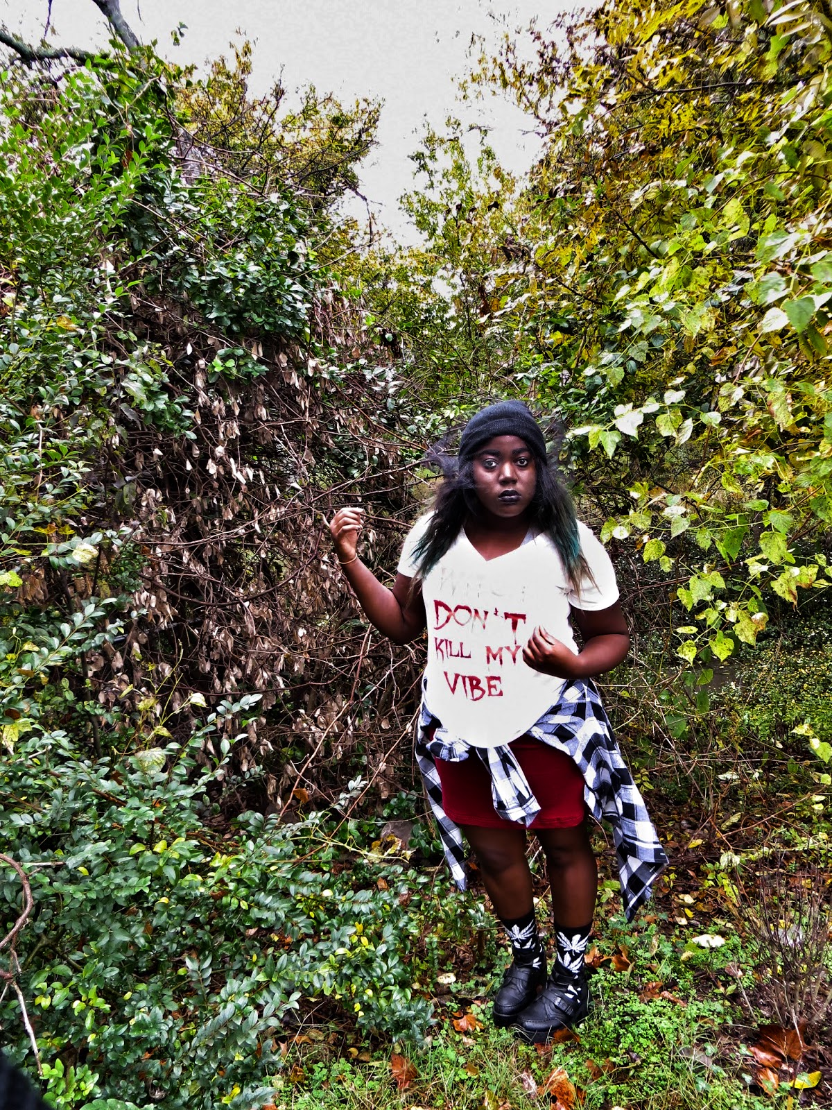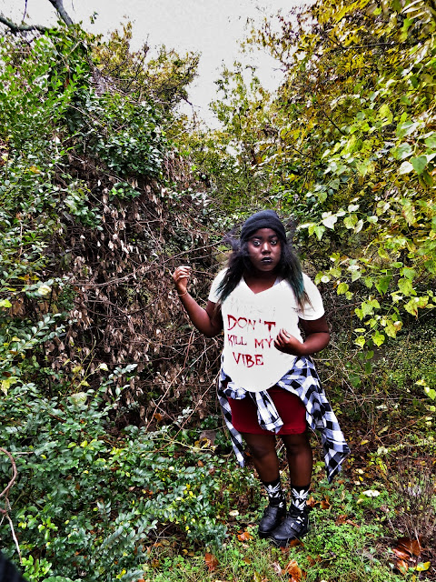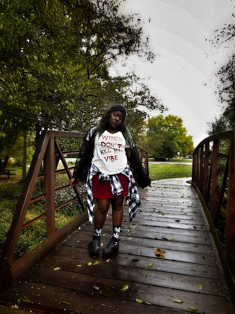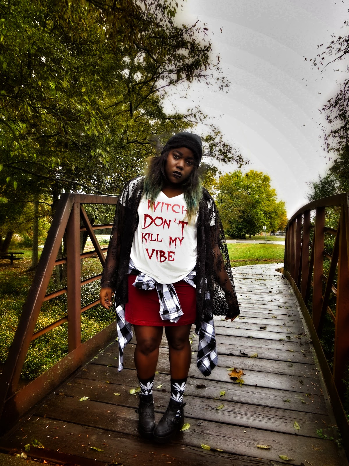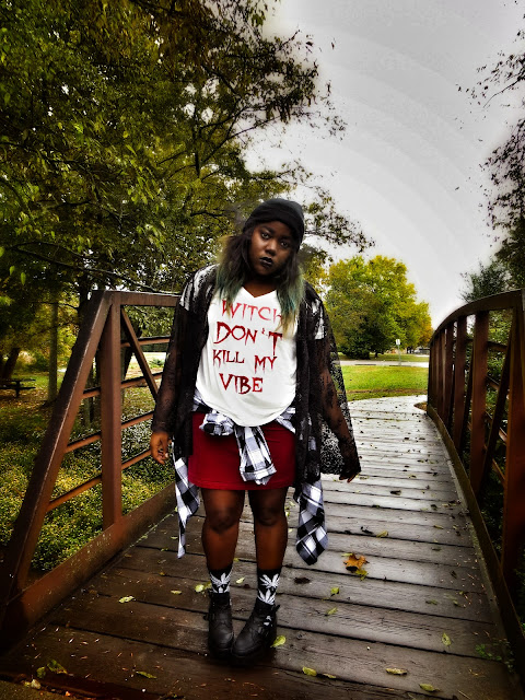 I'm basically dressed up as my take on the modern day witch. I made sure to include the color black, lace, velvet and all those things I love about Witch's costumes but made it my own by adding a veiled beanie, some Huf plantlife socks and my trusty studded denim jacket. I saw this graphic printed on a Unif tank on Urban Outfitters but I couldn't see myself paying $80 for a tank in October that I couldn't wear year long so I ironed on my own version. I love how it came out and I am definitely inspired to make more graphics tees.